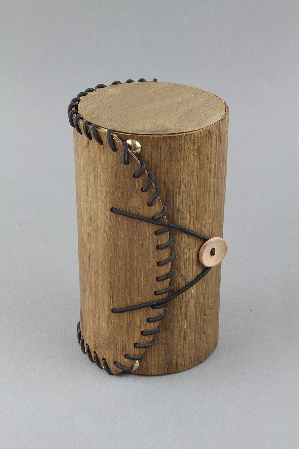 10 cm çapı, 16,5 cm yüksekliği ağaç kaplama etrafı el dikişli düğmeli parfüm kutusu