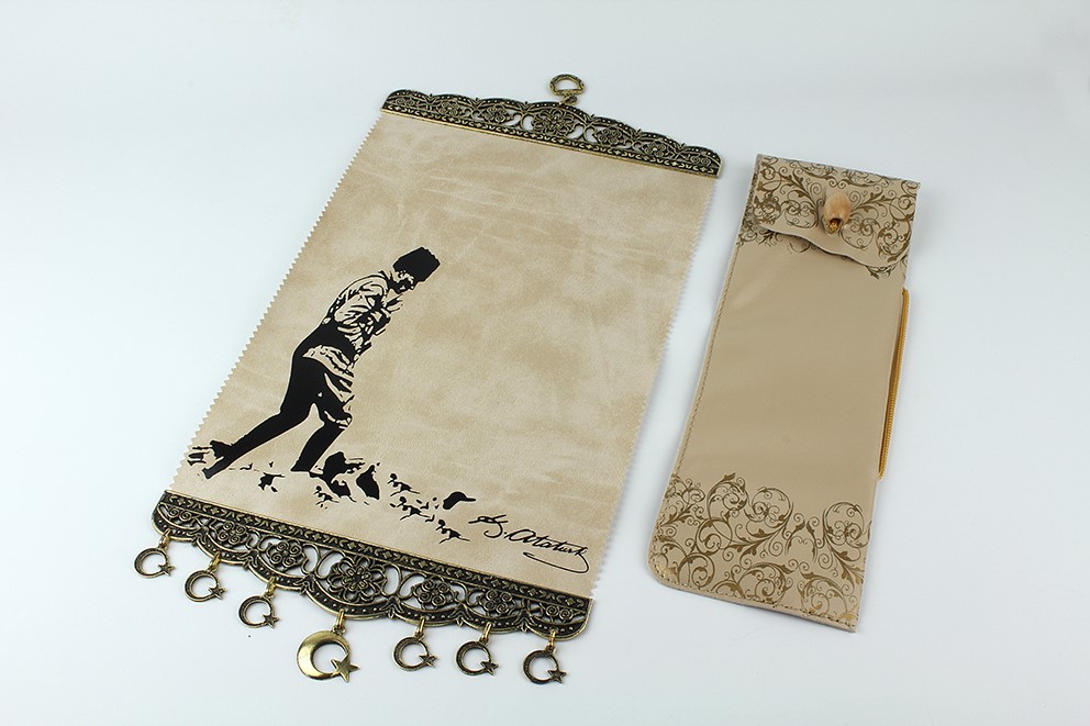 40 x 20 cm ölçülerinde deri üzerine serigrafi Atatürk baskılı, altında sallanan Ay-yıldız metallerle süslenmiştir, deriden muafaza kılıfı mevcuttur.