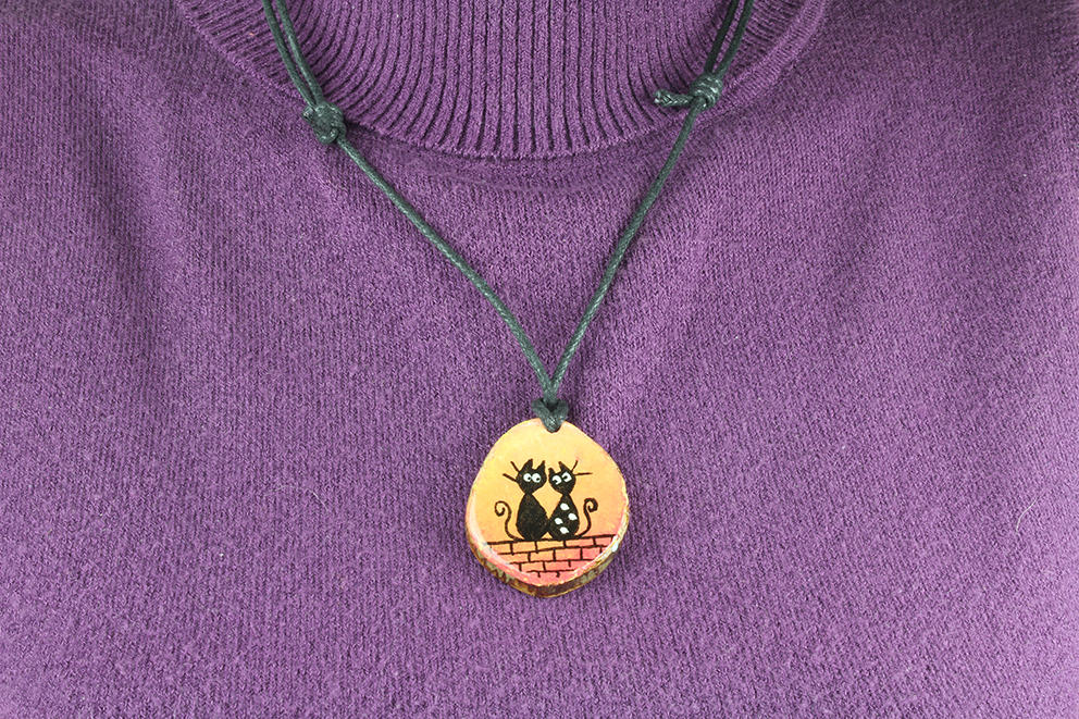 Doğal ağaç üzerine tamamı el boyama, hakiki deri ayarlanabilinir deri ipli, kedili kolye