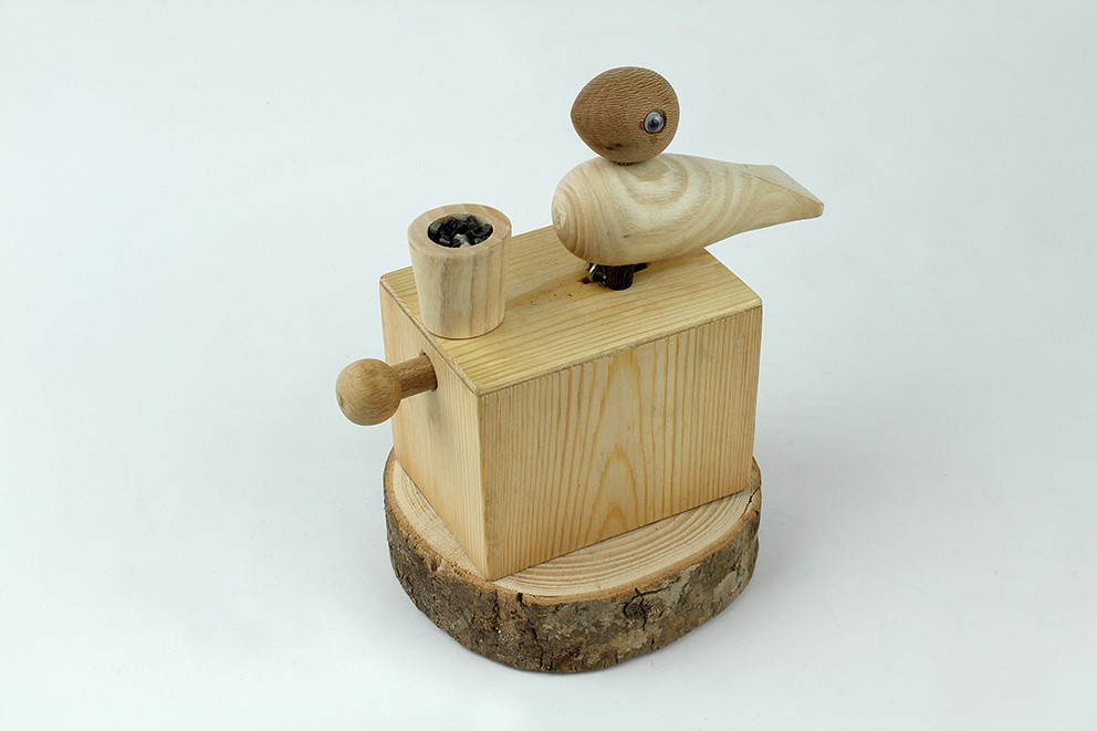 17 cm genişlik, 14 cm yükseklik ahşap, yandaki kolu çevirerek kuş yem yiyerek hareket ettirilir.