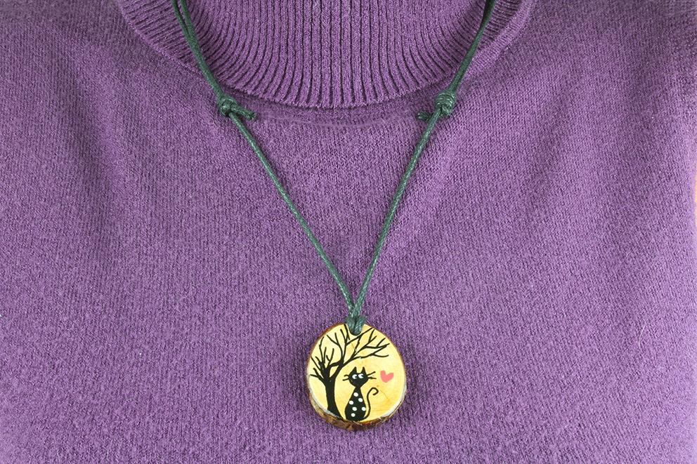 Doğal ağaç üzerine tamamı el boyama, hakiki deri ayarlanabilinir deri ipli, kedili kolye
