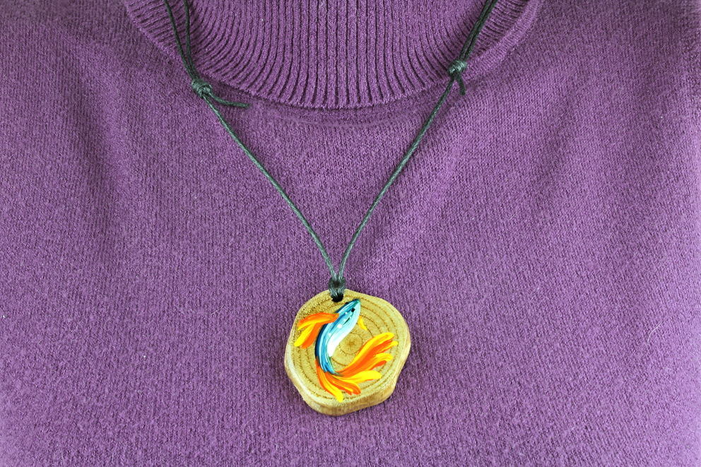 Doğal ağaç üzerine tamamı el boyama, hakiki deri ayarlanabilinir deri ipli, balıklı kolye