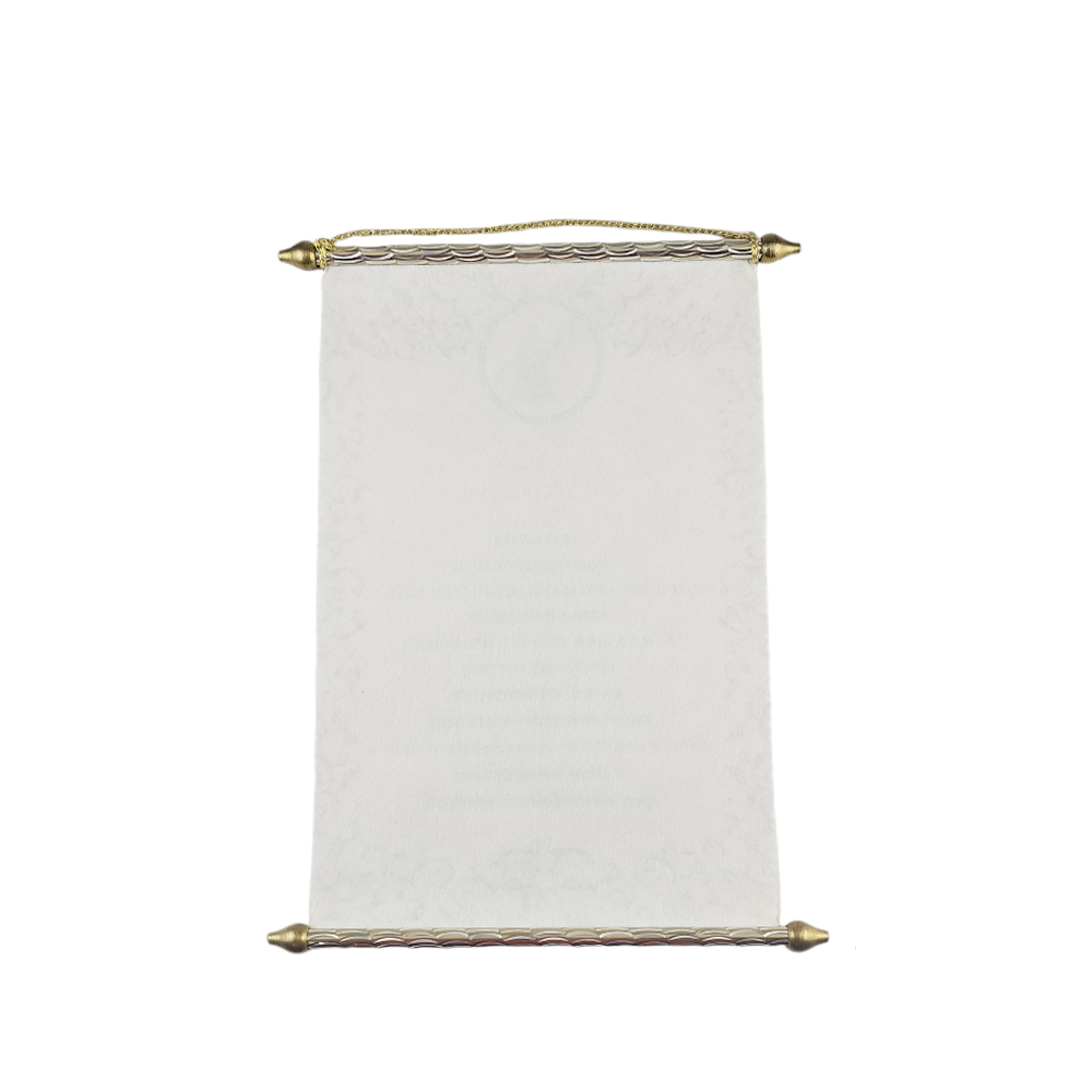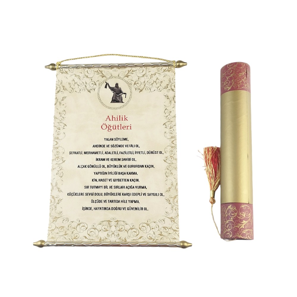 26 X 33 cm ölçülerinde krem deri üzerine Ahilik Öğütleri serigrafi baskılı dört bir köşesi pirinç topuzlu olup, asmak için altın sarısı dekoratif ip kullanılmıştır, sunum kutusu püsküllü silindir şeklindedir ölçüleri 30 cm yüksekliği 5 cm çapındadır.