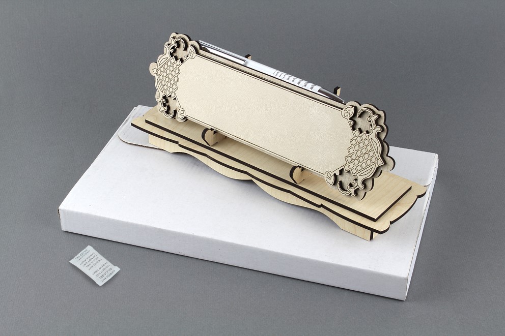 23 x 6,5 x 10 cm ölçüsünde arkası kısmı kalemlikli, nem koruyuculu, kutulu, krem masa üstü isimlik