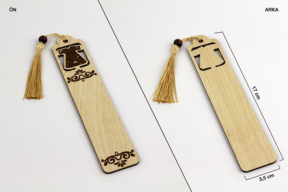 17 cm uzunluğunda, 3,5 cm genişliğinde, 3 mm çift yüz krem mdf, altın yaldız püsküllü, ahşap boncuklu kitap ayracı