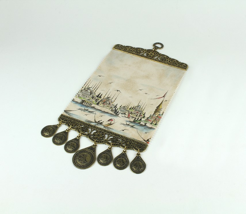 32 X 15 cm ölçülerinde birinci kalite deri üzerine renkli İstanbul silüeti baskılı altı ve üstü metallerle süslenmiştir