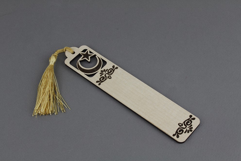 17 cm uzunluğunda 3,5 cm genişliğinde 3 mm krem mdf, altın yaldız püsküllü kitap ayracı