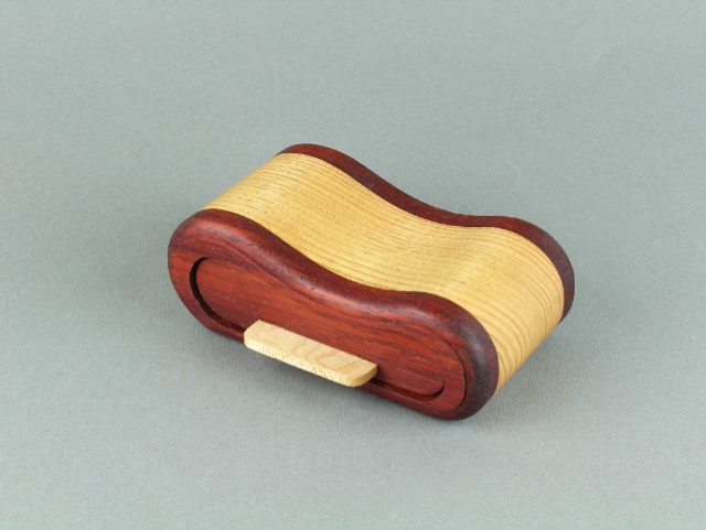 14 cm genişlik, 7 cm derinlik, 5 cm yüksekliğinde sapelli ve kiraz ağacından tamamı el yapımı özel tasarım kutu