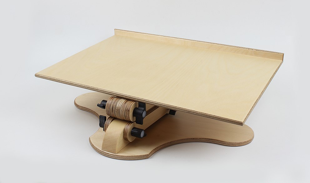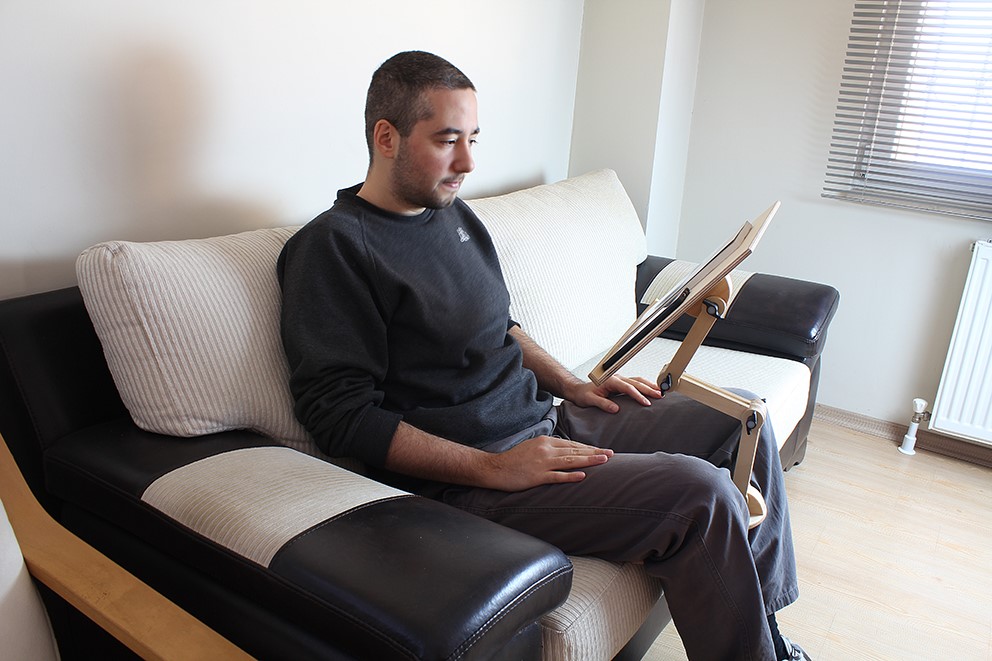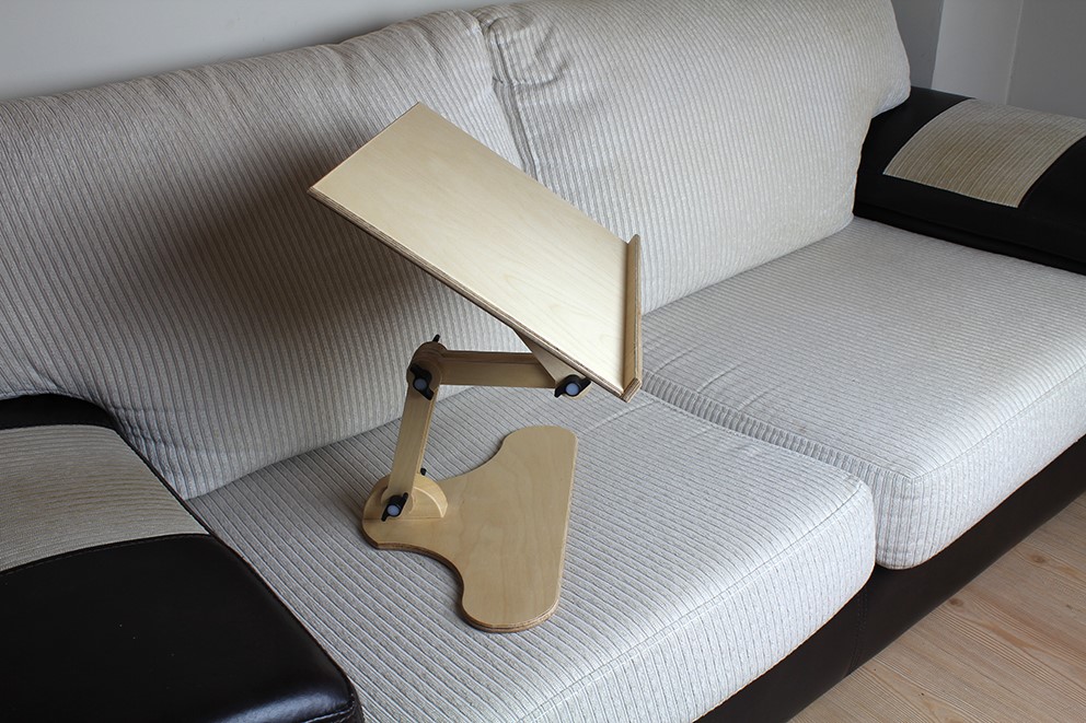 Yüksekliği 50 cm, sehpa ölçüleri 42 X 29 cm katlanabilir koltukta, sandalyede bacak yapısına uygun olarak tasarlanmış okuma, bilgisayar kullanımına uygun huş ağacından ahşap sehpa