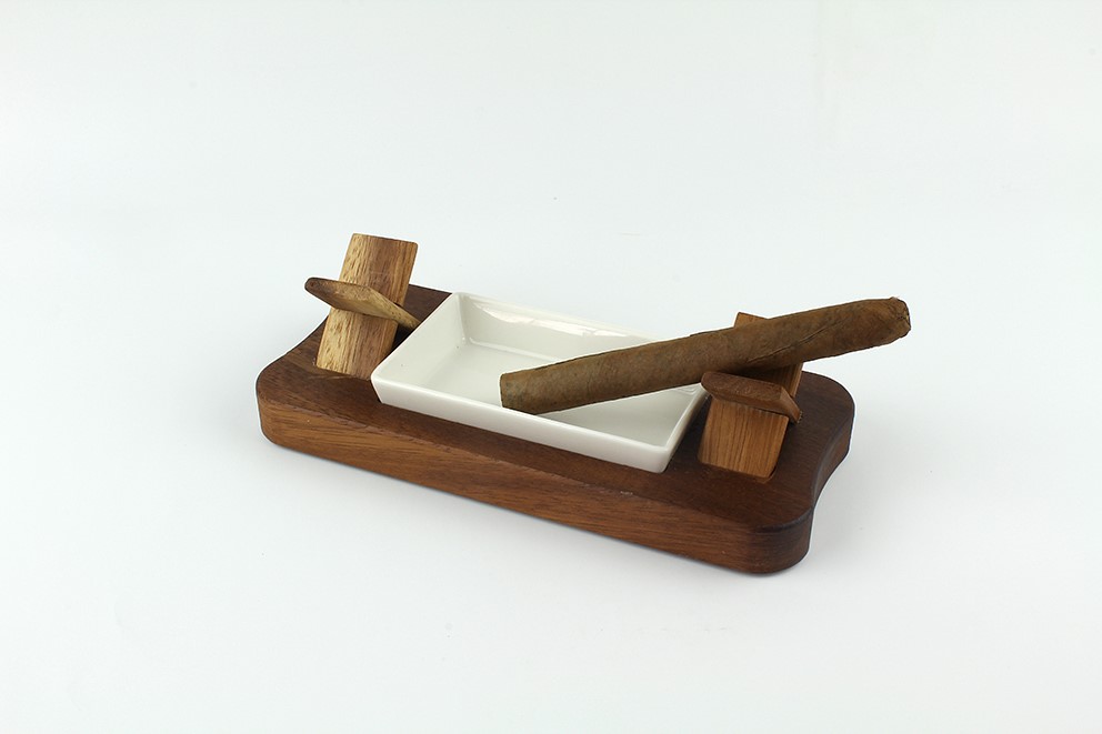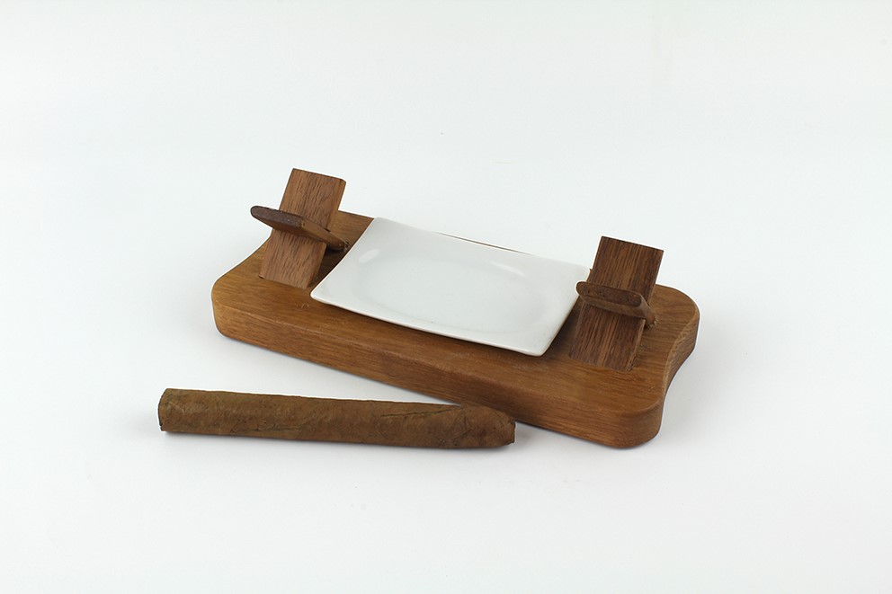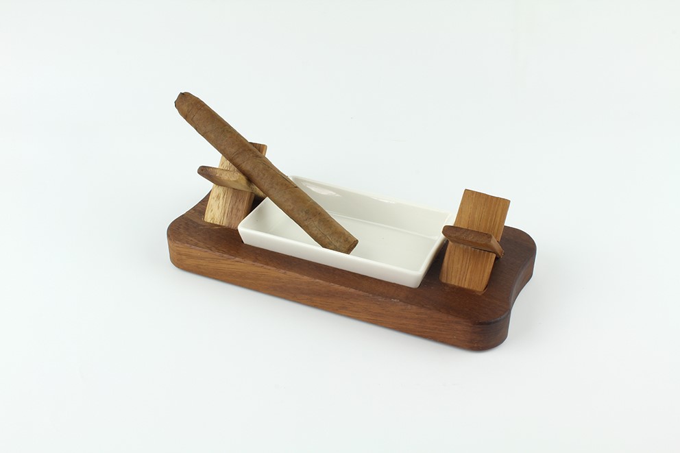 21 cm genişlik, 9,5 cm derinlik, 6 cm yükseklik iroko ağacından porselenli puro kül tablası