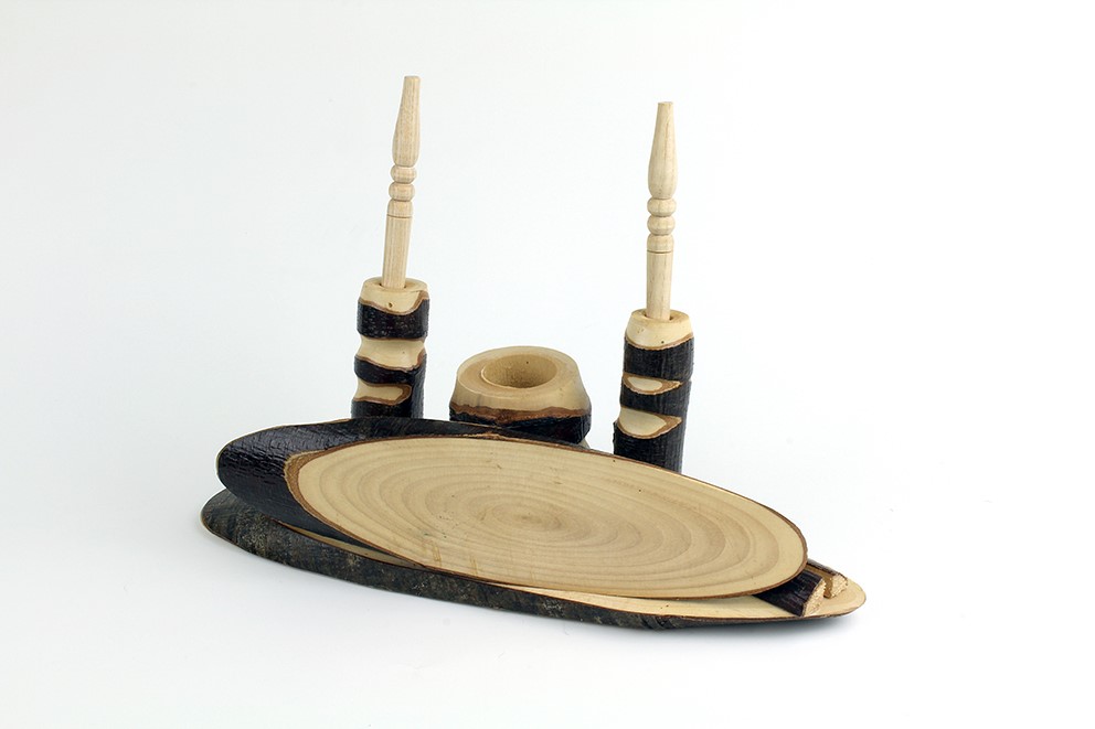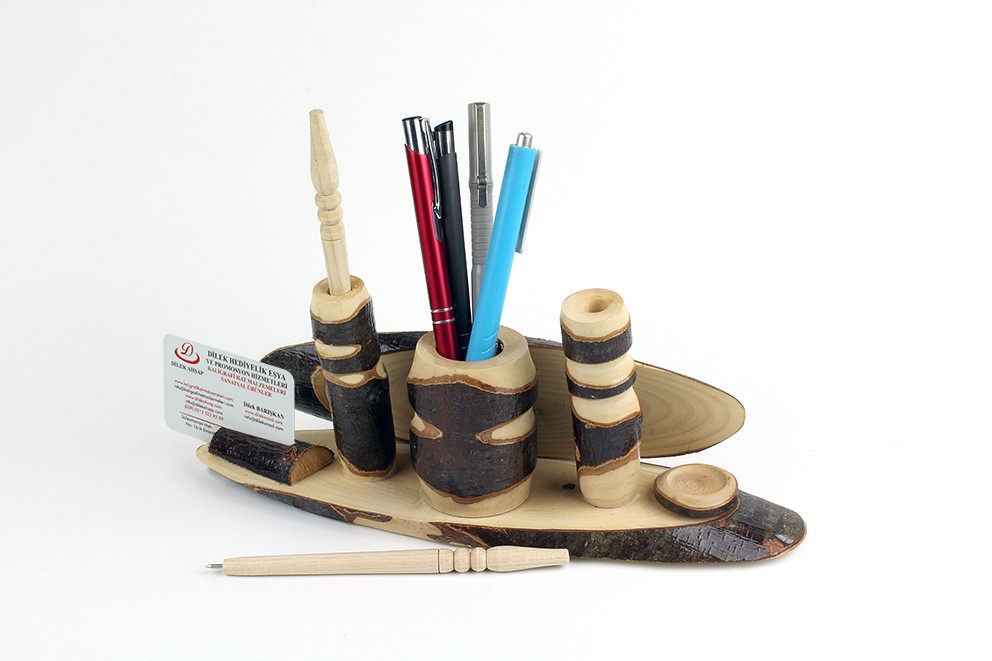 Ağaç kalemlikli, kartvizitlikli, iki adet ağaç kalemli masa üstü isimlik dolgu verniklidir, ölçüleri doğal ağaç oluşunda değişkendir,  kutusu mevcuttur.