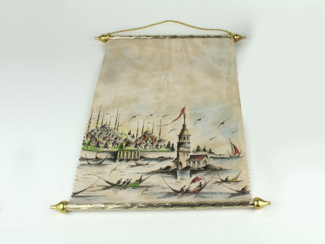 26 X 33 cm ölçülerinde birinci kalite krem deri üzerine, renkli serigrafi baskılı, İstanbul Kız Kulesi Silüeti baskılı, dört bir köşesi pirinç topuzlu olup, asmak için altın sarısı dekoratif ip kullanılmıştır.