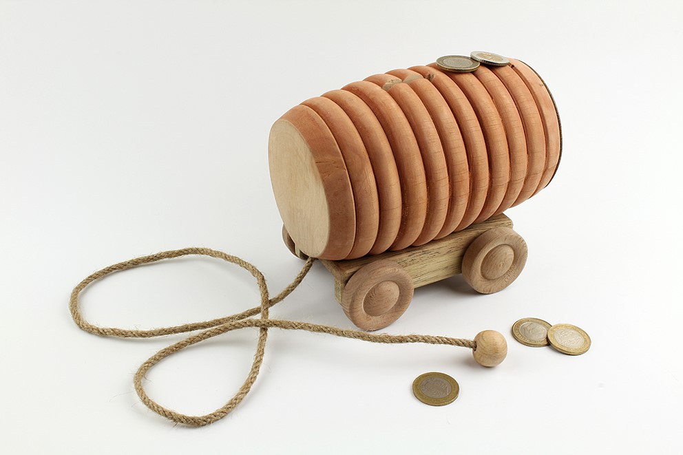 18 cm uzunluğunda, 16 cm yüksekliğinde, 11 cm genişliğinde tekerlekli fıçı kumbara