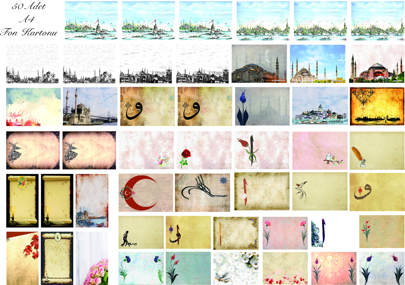 250 gr Amerikan bristol fon kartonu , 50 farklı model, A4 boyutunda, içerik sabit olup değiştirilemez.