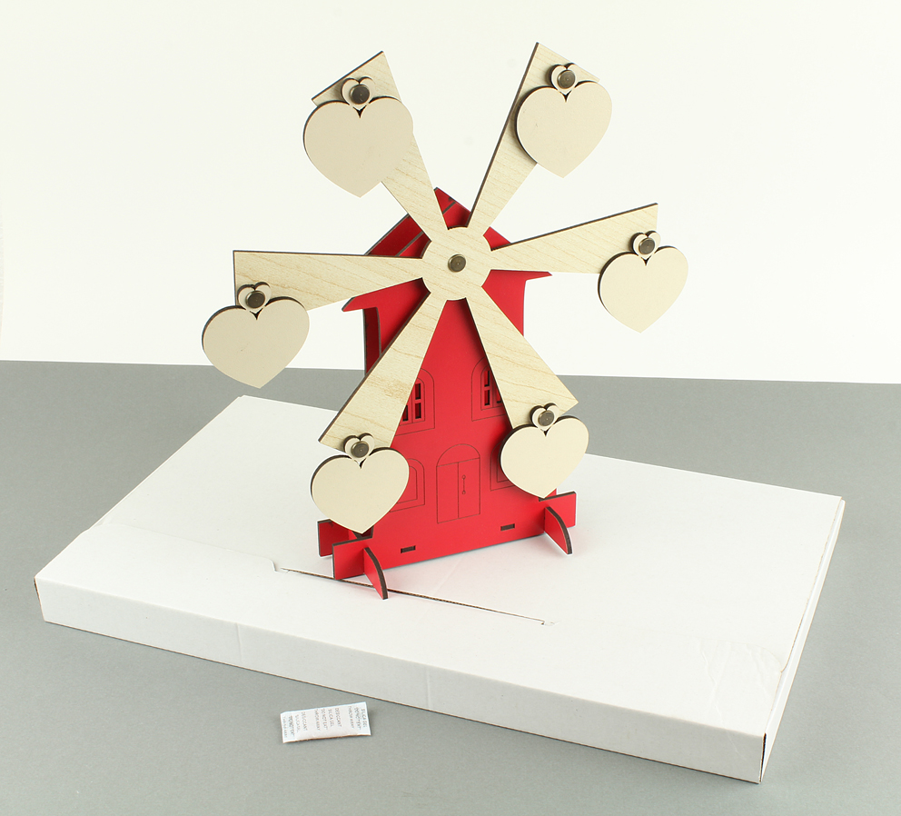 27 cm yükseklik 21 cm genişlik,  5 cm çapında 6 adet kalp, kendi etrafında dönen, 3 mm kırmızı mdf  yeldeğirmeni, kutulu ürün