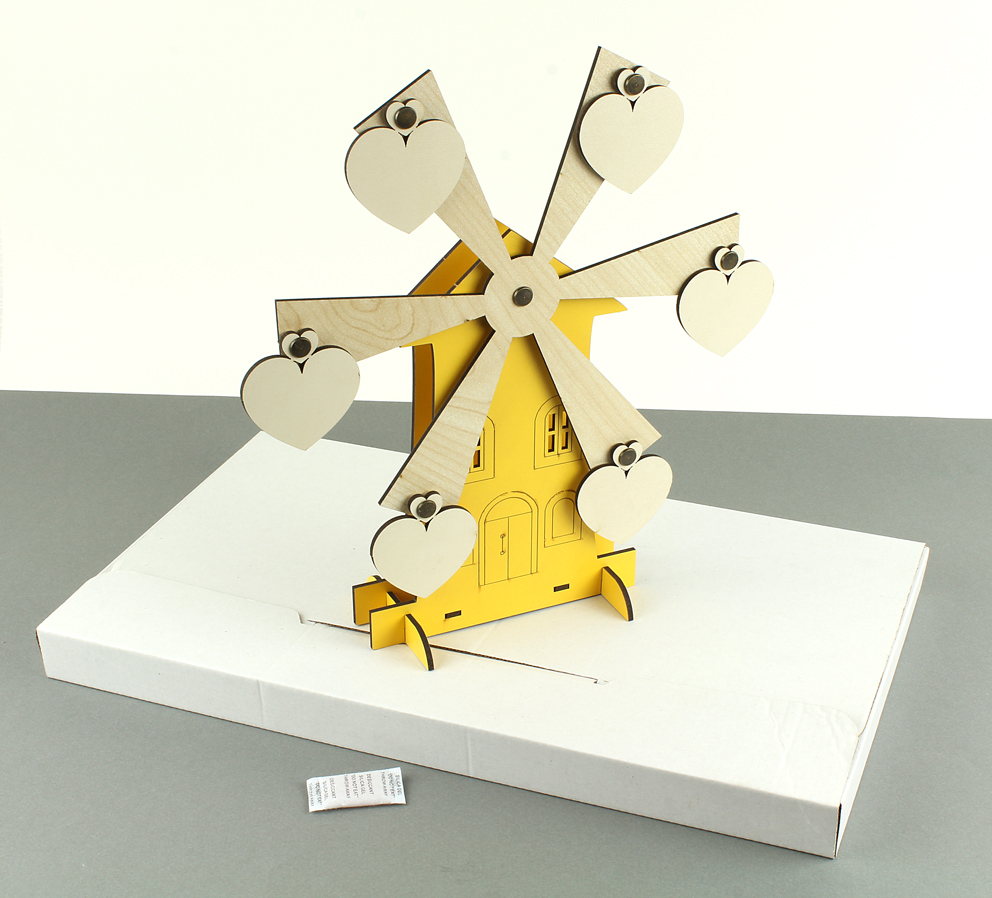 27 cm yükseklik 21 cm genişlik,  5 cm çapında 6 adet kalp, kendi etrafında dönen, 3 mm sarı mdf  yeldeğirmeni, kutulu ürün