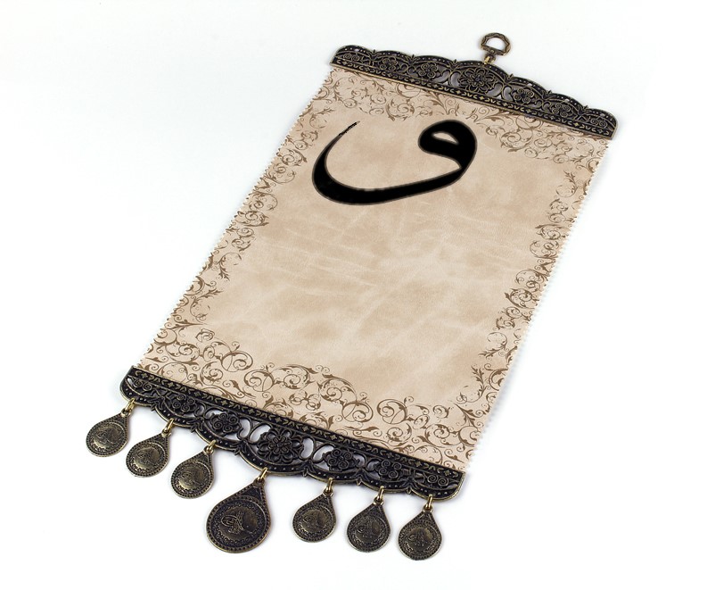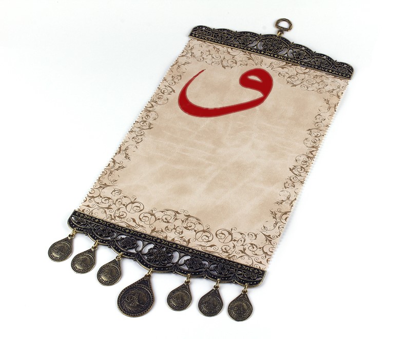 40 x 20 cm ölçülerinde deri üzerine Vav ve sarmaşık desen serigrafi baskılı, Vav'ın dış kontürleri çizilmiş olup istenilen renkte renklendirilebilinir, altı ve üstü metallerle süslenmiştir,