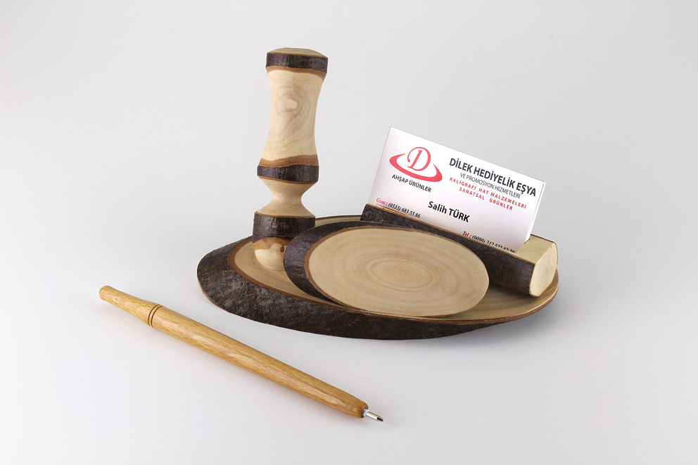 Doğal ağaç, vernikli, kartvizitlikli ve kalemli masaüstü isimlik