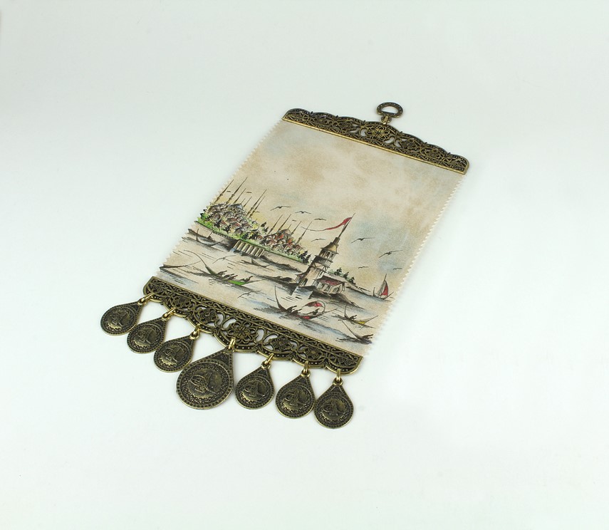 32 X 15 cm ölçülerinde birinci kalite deri üzerine renkli İstanbul Kız Kulesi silüeti baskılı altı ve üstü metallerle süslenmiştir.