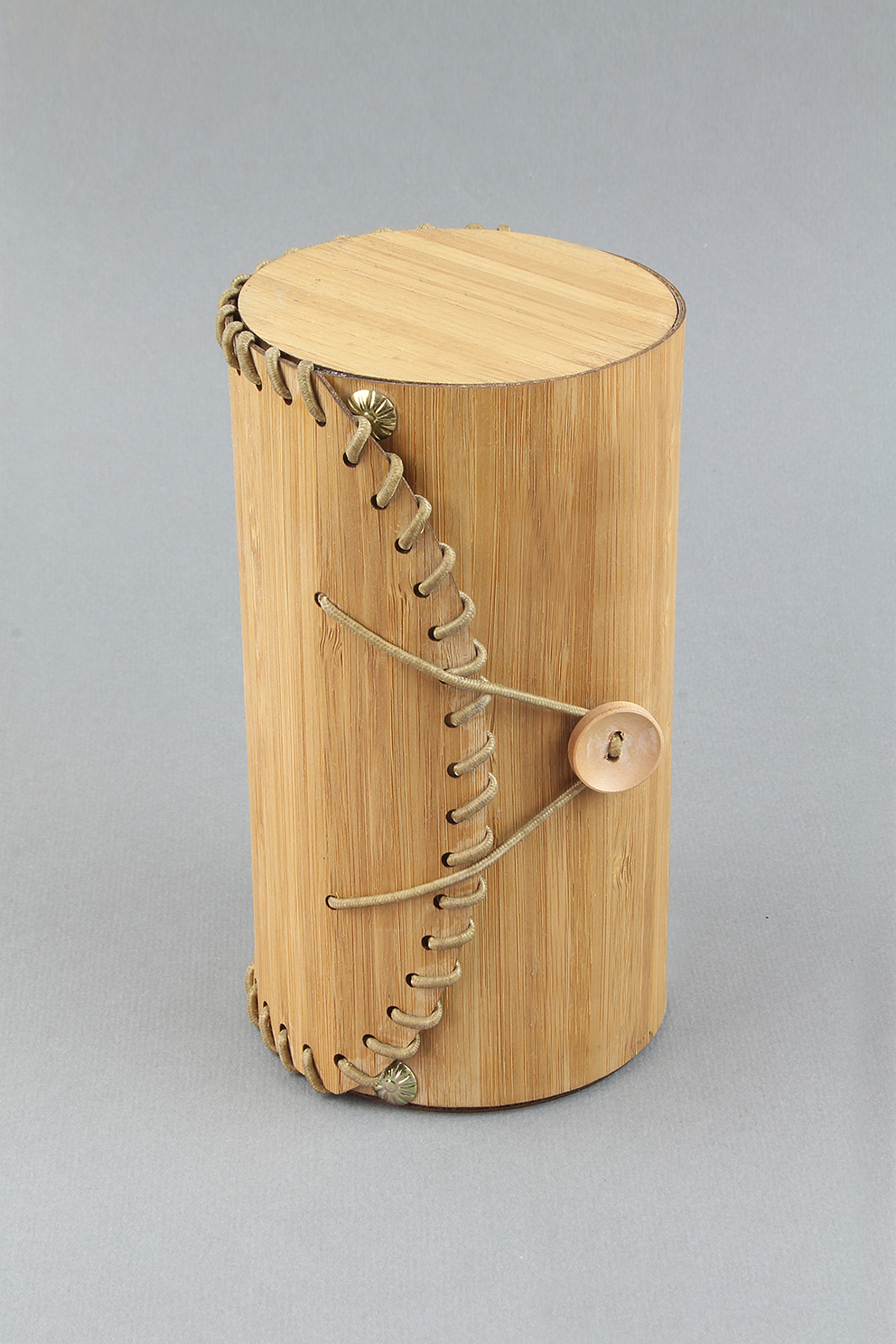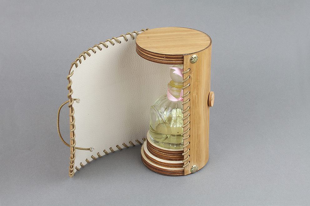 10 cm çapı, 16,5 cm yüksekliği ağaç kaplama etrafı el dikişli düğmeli parfüm kutusu