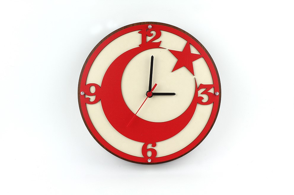 30 cm çapında, 3 mm mdf, açılı, kutulu, Ay Yıldız saat