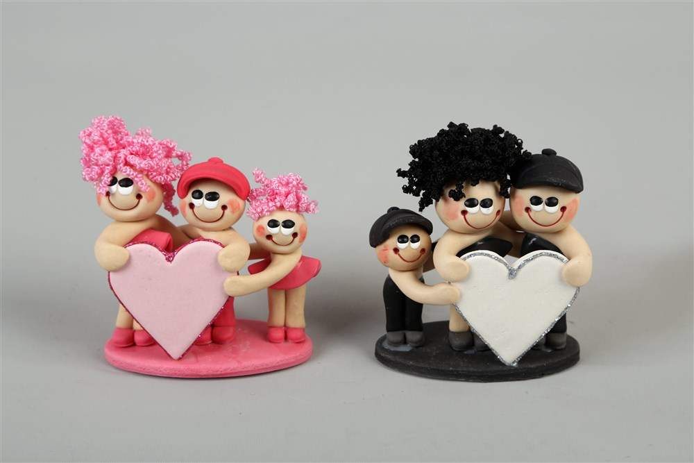 11 cm yüksekliğinde renkli üçlü kalpli hamur bebekler anne, baba, çocuk , ürün kutuludur.