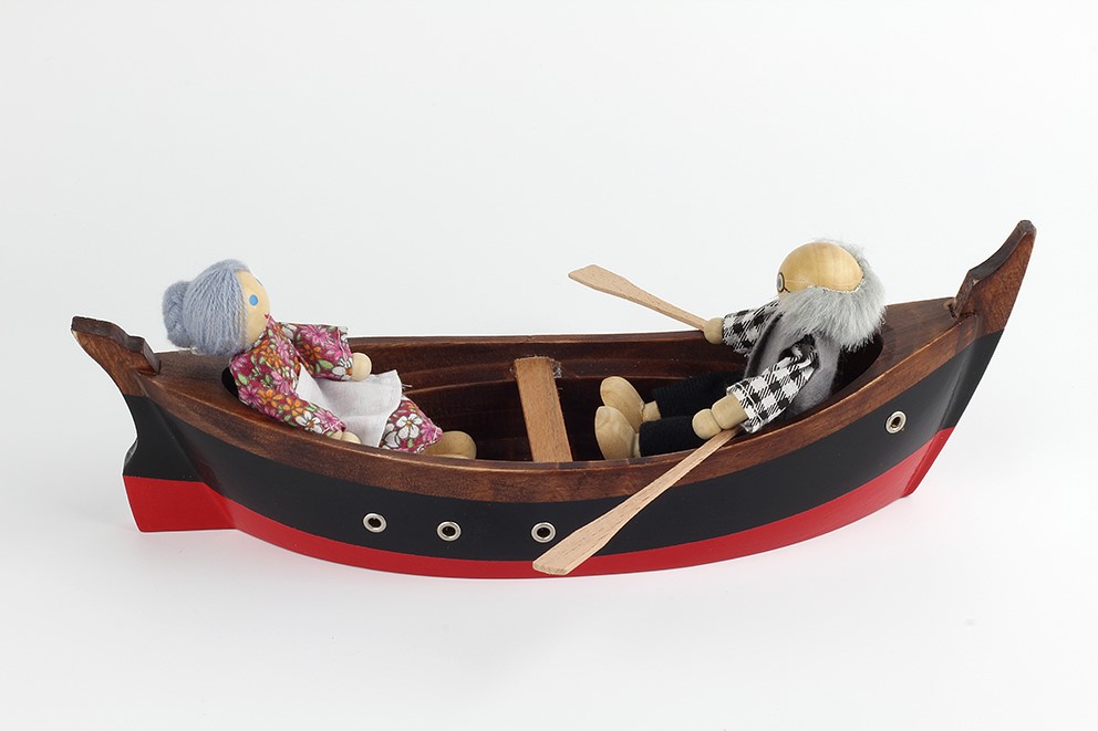 29 cm uzunluğunda, 8 cm genişliğinde, siyah beyaz mini dede ve nine figürlü tamamı el yapımı sandal
