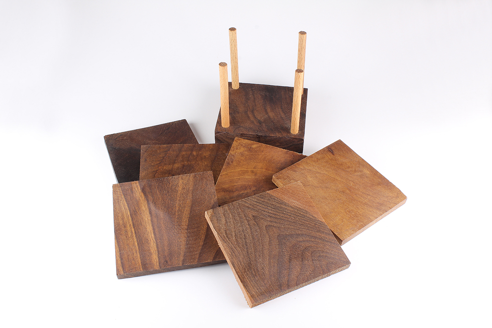 10 x 10 cm ölçüsünde 6 adet ceviz ağacı kökünden bardak altı ve standı