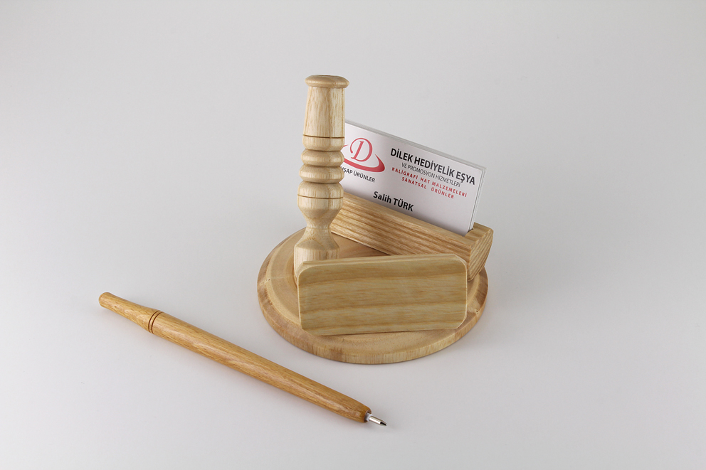 Ahşap, vernikli, kartvizitlikli ve kalemli masaüstü isimlik