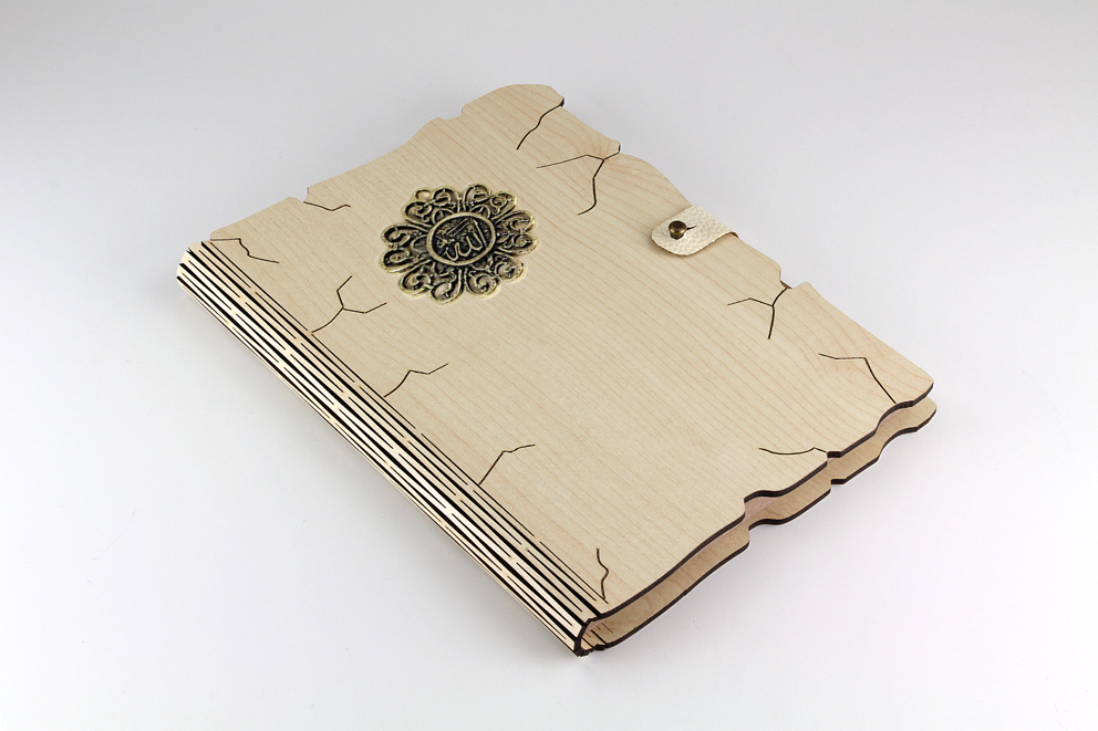 20 cm yüksekliği 16 cm genişliği, üzerinde metalden Allah lafsı bulunan ahşap defter 60 yaprak 120 sayfa kraft kağıt, ürün kutuludur.