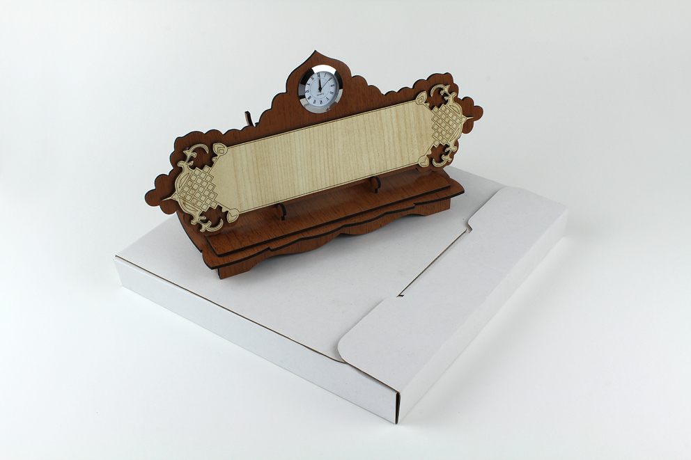 Alt zemin 22,5 x 11 cm ölçüsünde, yazı alanı 30 x 12 cm ölçüsünde, bitmiş ölçü 30 x16 cm, kutulu, nem koruyuculu, ceviz rengi  1.kalite saati, masa üstü isimlik