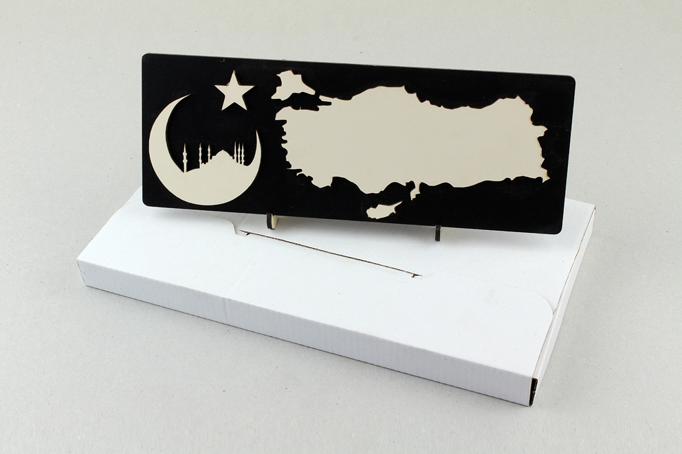 23 cm genişliğinde, 8,5 cm yüksekliğinde, 3 mm çift taraflı siyah mdf, kutulu, kalemlikli teşhir ayaklı, siyah Türkiye haritası isimlik
