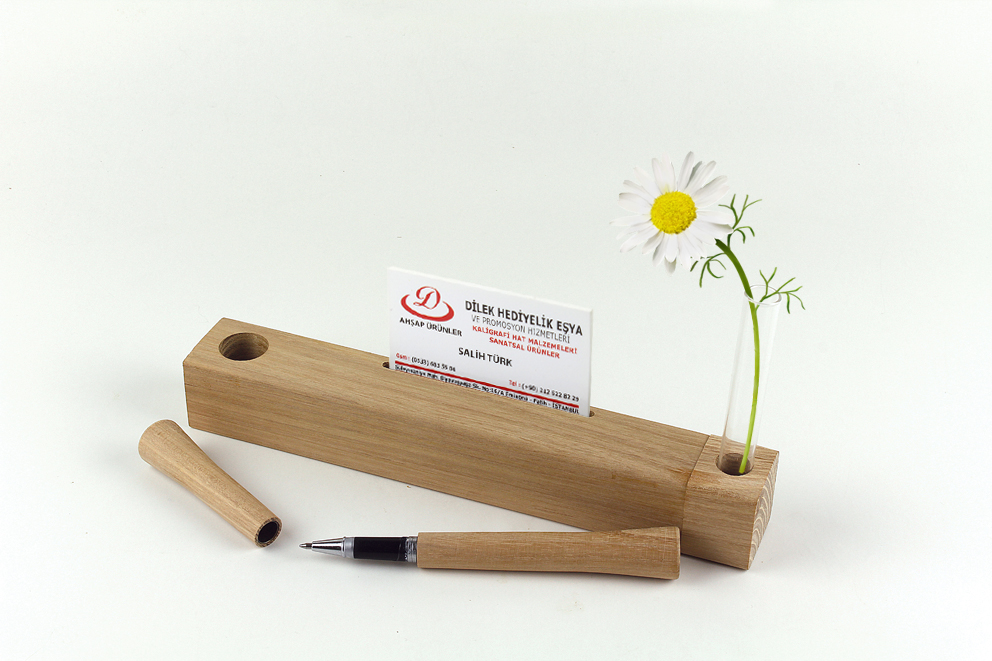 23,5 cm genişlik, 3,5 cm yükseklik, 3,3 cm derinliğinde zeytin ağacından özel tasarım masaüstü kartvizitlikli, zeytin ağacından kalemi, cam çiçeklikli masaüstü