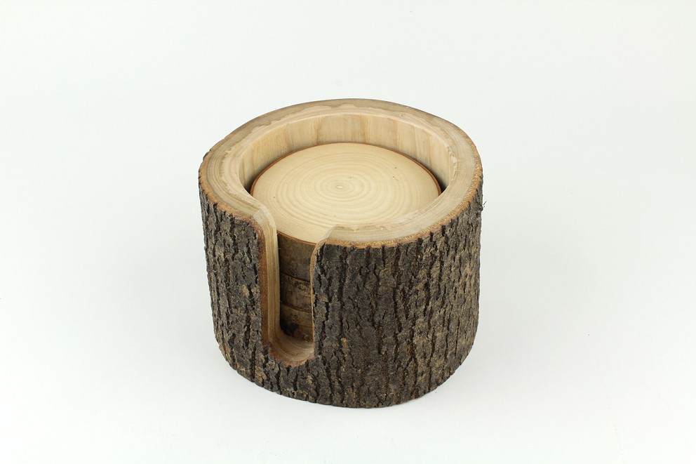 6 adet doğal ağaç bardak altı ve dekoratif doğal ağaç dış toplama kabıyla